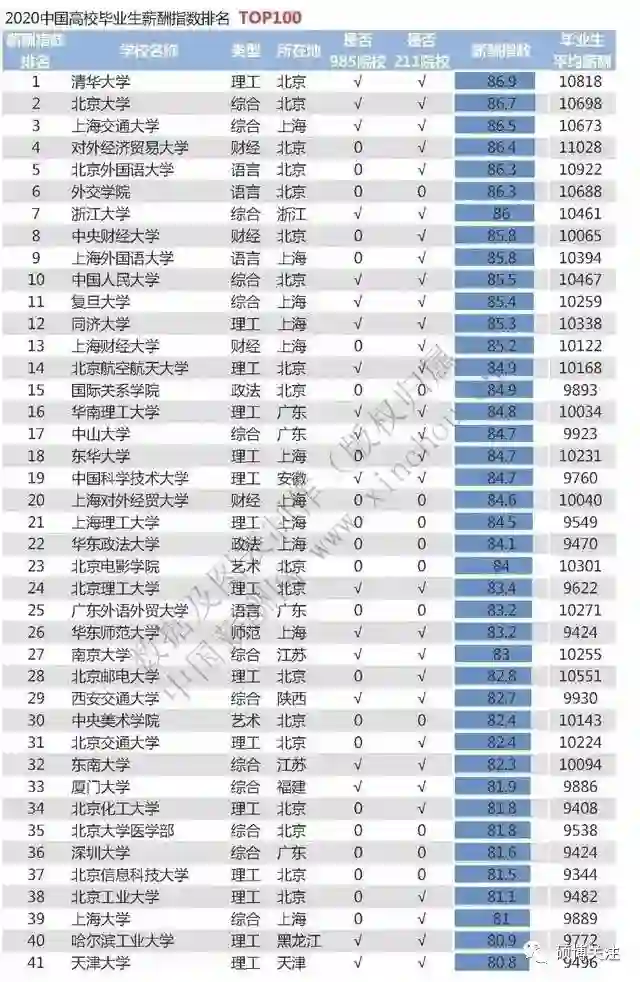 近日,中国薪酬网发布了《2020中国高校毕业生薪酬指数排名》。此次排名按照工资水平、就业率、人才成长率、薪酬增长率四个要素,排出了TOP 100。