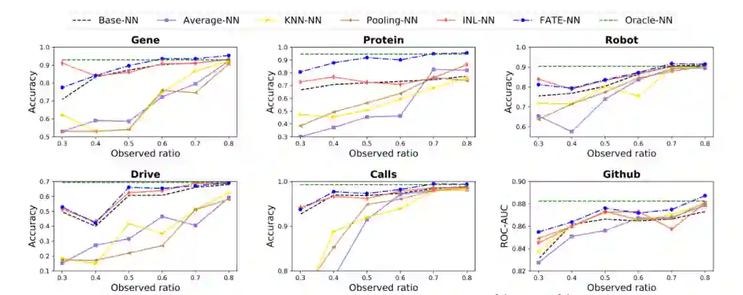 对比以下方法:1)Base-NN只用观测特征训练和测试;2)Oracle-NN:使用全部特征训练和测试;3)Average-NN/KNN-NN/Pooling-NN:使用average pooling聚合所有特征embedding/KNN聚合相近特征embedding/不含参数的mean pooling GCN聚合相邻特征embedding来推断新特征的embedding;4)INL-NN先在仅有观测特征的训练数据上训练到饱和再在新特征上局部更新。在6个小数据集上,考虑不同的观测特征比例(从30%到80%),对比结果如下(图中FATE为本文提出的方法)。