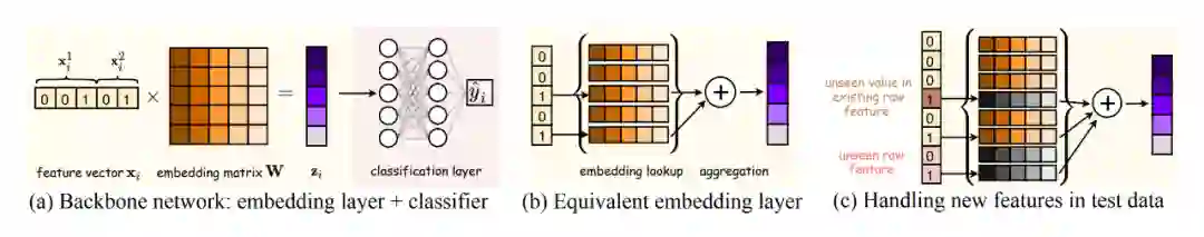 可以分解为两个级联的子模块,分别是特征embedding层和classifier层(如下图(a)所示)。这里的embedding层可以视为一个特征embedding字典,每一行是一个特征的embedding,它对输入向量