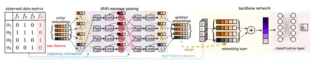 事实上,当我们利用输入数据将样本与特征表示在一张图上后,通过图结构我们就能得到样本-特征以及特征-特征之间的关系。这里特征-特征的关系由样本作为中间节点,也就是图上的二阶相邻信息给出。基于此,图的建立为我们提供了天然的已观测特征与未观测特征的联系。当模型完成训练后,我们可以得到已观测特征的表示embedding,而后对于在测试阶段引入的新特征,我们就可以利用图结构做信息传递,把已观测特征的embedding信息通过图神经网络计算新特征的embedding,从而实现特征的外推。
