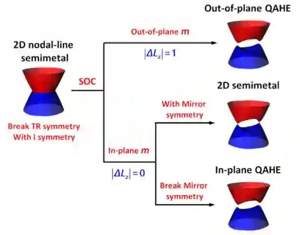 随后,我们系统研究了单层氯化镧的拓扑特性。该材料晶体结构对称性较高,当面内磁矩沿特定角度时,自旋轨道耦合会打开简并的二维节点线,并退化成垂直于磁矩方向的镜面上两个简并点,从而形成半金属相,如图5 左边所示。然而,当面内磁矩沿其它角度时,体系不存在任何镜面对称性,自旋轨道耦合会在简并的节点线上每一点都打开带隙,从而实现量子反常霍尔效应。