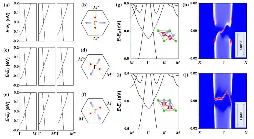 图5. (a) - (f) 面内磁矩沿特定角度形成的半金属相;(g) - (j) 面内磁矩沿其它角度形成的相反陈数的量子反常霍尔效应 [PRL 121, 246401 (2018)]。