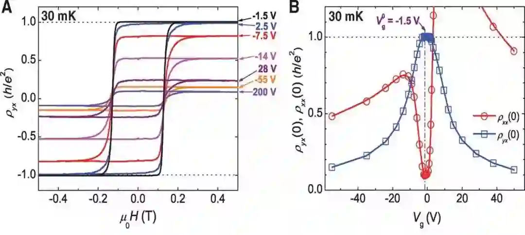 图3. (A) 不同栅压下霍尔电阻随磁场的变化;(B) 零场下霍尔电阻和纵向电阻随偏压的变化[Science 340, 167 (2013)]。