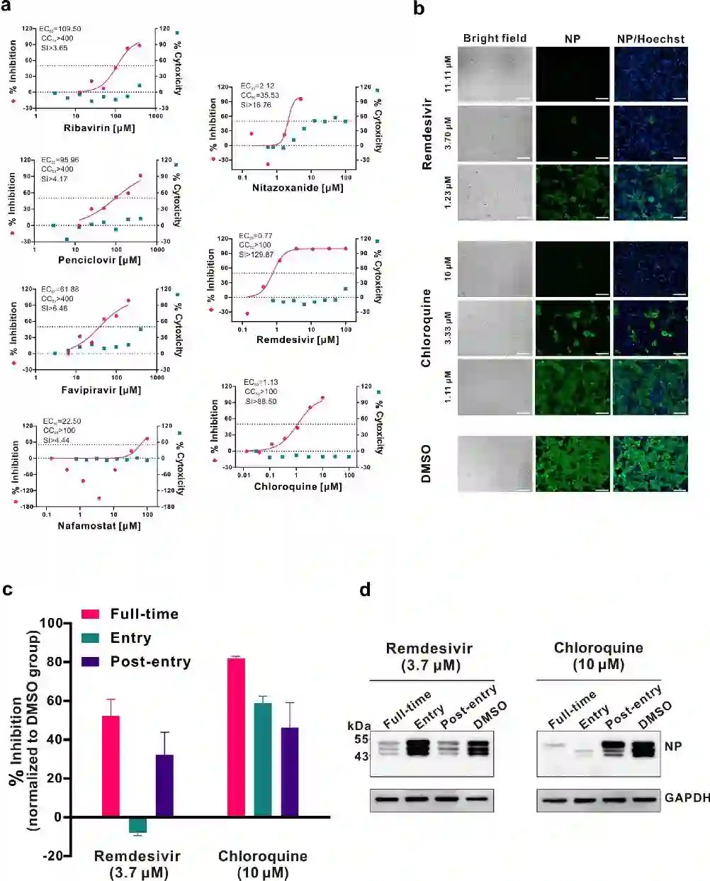 该研究表明,在Vero E6细胞上,瑞得西韦(Remdesivir, GS-5734)对2019-nCoV的半数有效浓度EC50=0.77 uM(微摩尔每升),选择指数SI大于129;磷酸氯喹(Chloroquine)的EC50=1.13 uM,SI大于88,说明上述两种药物在细胞水平上能有效抑制2019-nCoV的感染,其在人体上的作用还有待临床验证。