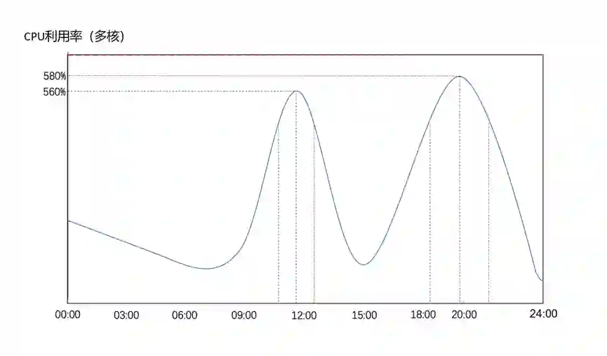小王首先检查公司已上云的典型业务的算力特征。由于公司业务偏计算型,所以他选择通过常见性能指标 CPU 利用率来观察算力消耗情况,发现公司业务常在中午 12 点左右和晚上 8 点左右迎来算力消耗高峰。