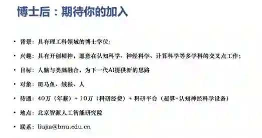 当然这一切离不开人才。然而在我国,既懂认知神经,人工智能又非常好的研究者寥寥无几。如何培养更多相关人才是一大重点。刘嘉提到,依托北京智源人工智能研究院,他们将以「40万年薪、10万科研经费,任意使用科研平台(超算+认知神经科学设备)」的待遇,不拘一格招聘具有开创精神,愿意在认知、神经、计算等多学科交叉点探索人工智能最前沿的博士后。