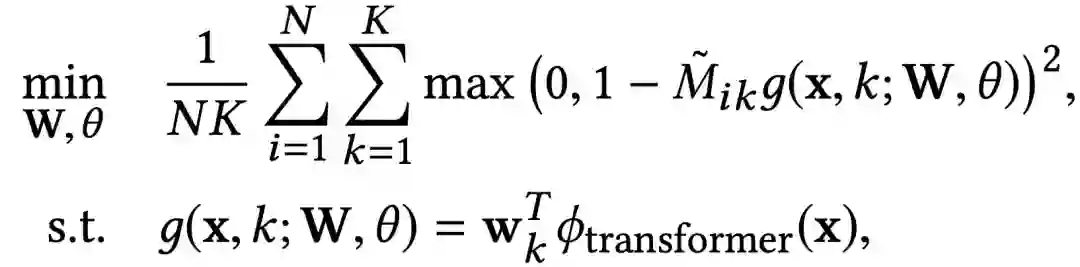2)作为神经匹配器的deep Transformer。经过SLI,原来难以解决的XML问题演变成了一个可行的XML子问题,其输出空间大小为K,是一个非常小的数。应用deep Transformer将每个文本实例映射到指定的相关集群。构建分类器: