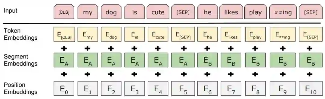 图4 BERT输入表示。输入嵌入是标记嵌入、分割嵌入和位置嵌入的总和。嵌入和位置嵌入的总和