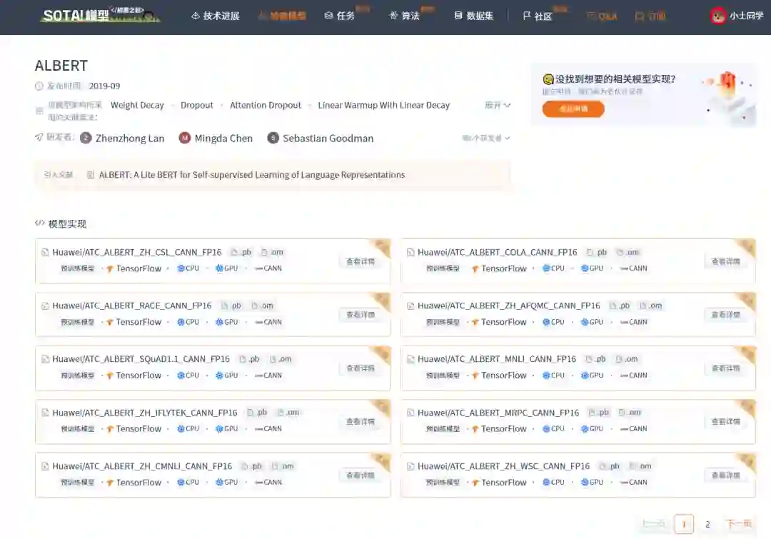 当前 SOTA!平台收录 ALBERT 共 13 个模型实现资源。