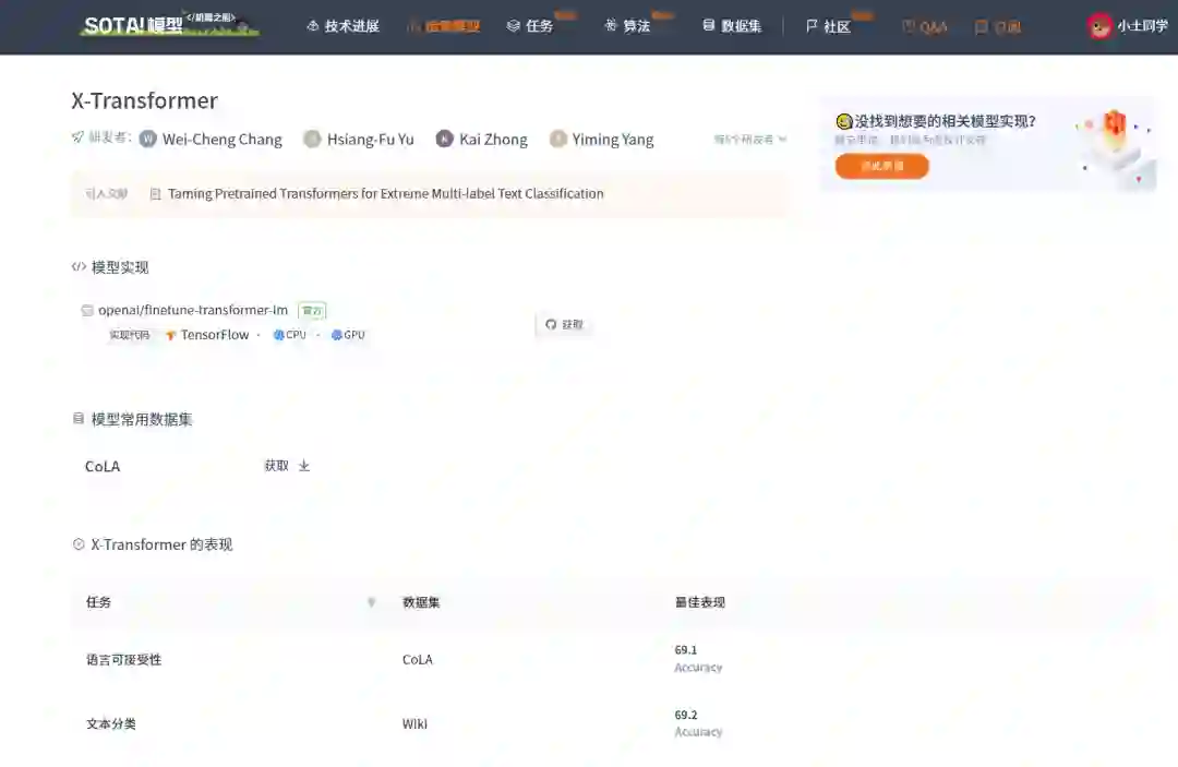 当前 SOTA!平台收录 X-Transformer 共 1 个模型实现资源。