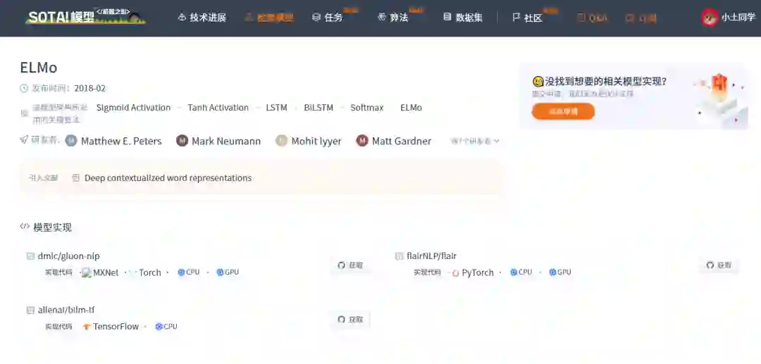 | ELMo | https://sota.jiqizhixin.com/models/models/e473edac-88cc-4a83-b533-d15c2ca0ea17 收录实现数量:3 支持框架:TensorFlow、PyTorch、MXNet 等 |