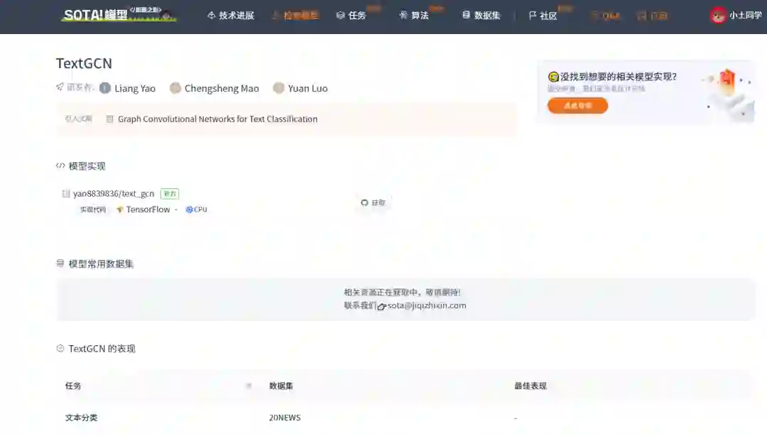 当前 SOTA!平台收录 TextGCN 共 1 个模型实现资源。