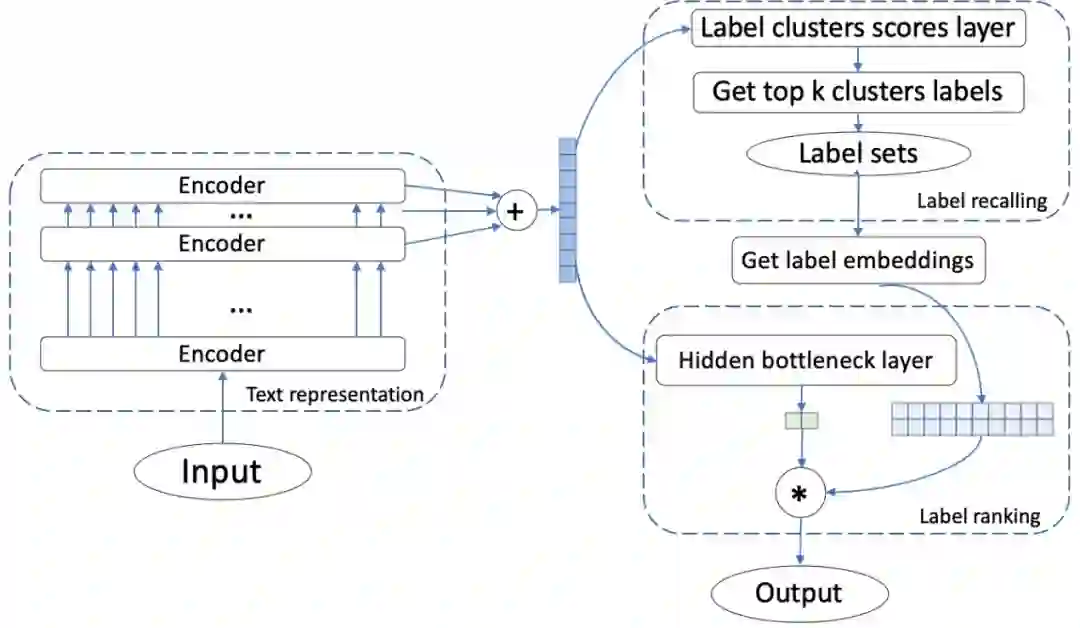 图7 X-Transformer框架。首先,语义标签索引减少了庞大的输出空间。然后在XMC子问题上对Transformer进行微调,该子问题将实例映射到标签集群。最后,在集群和转化器的输出上有条件地训练线性排名器,以便在预测的集群中对标签进行重新排名