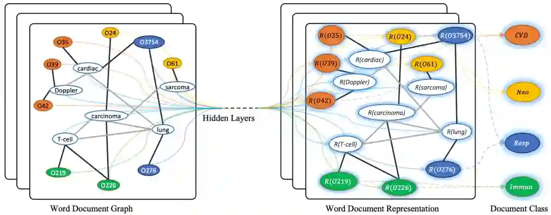 图10 文本GCN的示意图。样本取自Ohsumed语料库。以 "O "开头的节点是文档节点,其他节点是词节点。黑色粗边是文档-词的边,灰色细边是词-词的边。R(x)表示x的表示(嵌入)。不同的颜色表示不同的文档类别。CVD:心血管疾病,Neo: 肿瘤,Resp: 呼吸道疾病,Immun: 免疫学疾病