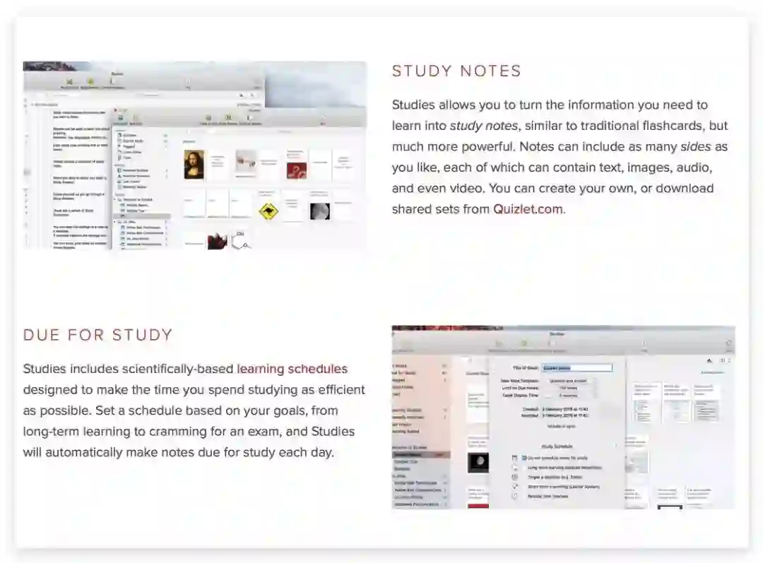Studies 是一款能帮你提高记忆效率的工具。你可以把公式、文字、图片、日期等等需要记忆的内容放到 Studies 里进行高效记忆,特别适合医学、法律、历史等专业的学生。