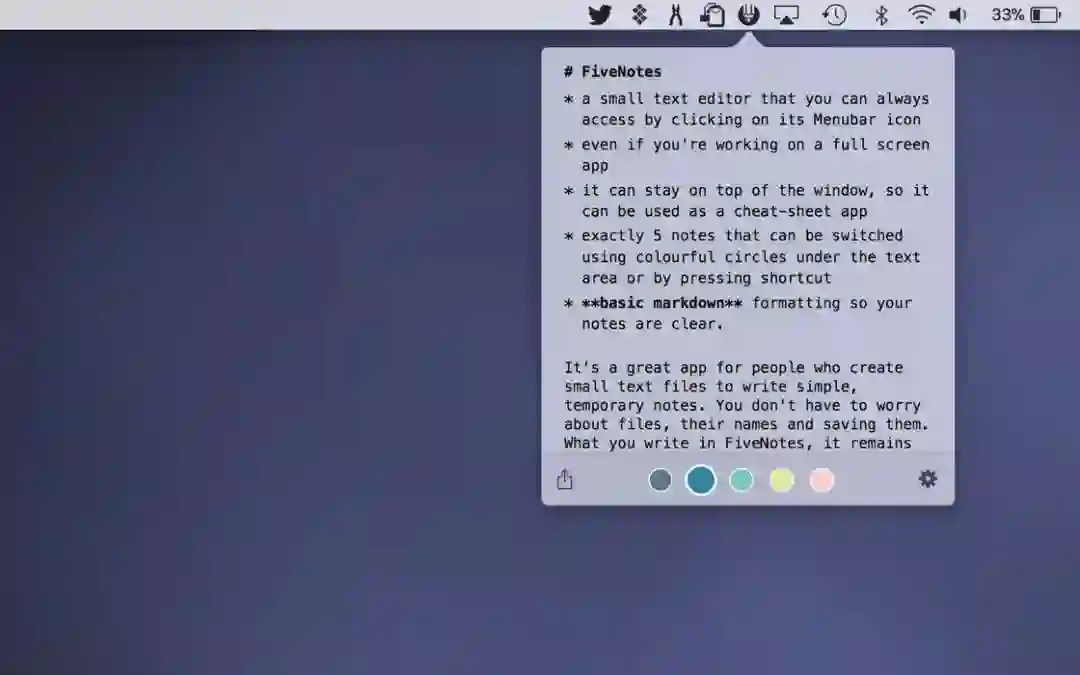 FiveNotes 是一款主打随时记录的笔记应用。你可以用它直接在菜单栏上用它记笔记,并且还支持 Markdown 格式。