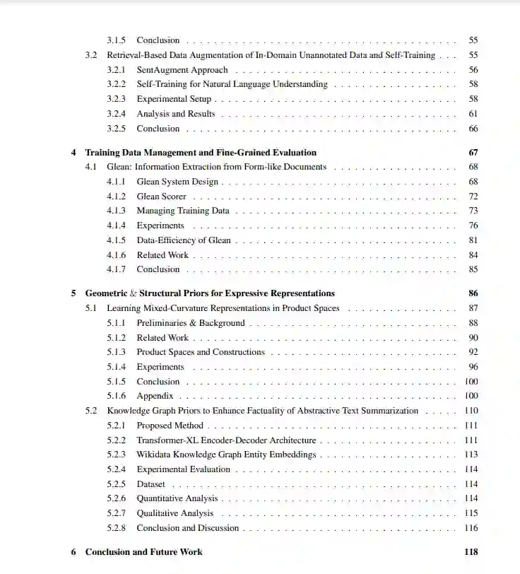 我们首先描述了我们在构建数据高效的机器学习方法方面的工作,通过物理驱动的一致性训练增强、尺度等变展开神经网络和使用未经训练的神经网络弱监督来加速磁共振成像(MRI)重建。然后,我们描述了我们在构建用于自然语言理解的数据高效机器学习方法方面的工作。特别地,我们讨论了一种监督对比学习方法用于预训练的语言模型微调和一种大规模数据增强方法来检索领域数据。与有效管理训练数据相关,我们讨论了我们提出的用于类表单文档gather的信息提取系统,并重点讨论了训练数据管理和相关工具中经常被忽略的方面。我们强调了有效管理训练数据的重要性,表明它至少与机器学习模型在真实数据集的下游提取性能方面的进展一样关键。最后,为了改进各种类型数据的嵌入表示,我们研究了具有异质曲率的空间。我们展示了混合曲率表示为图和词嵌入提供了更高质量的表示。此外,我们还研究了如何将Wikidata知识图谱中的实体嵌入到一个抽象的文本摘要模型中,以增强其真实性。