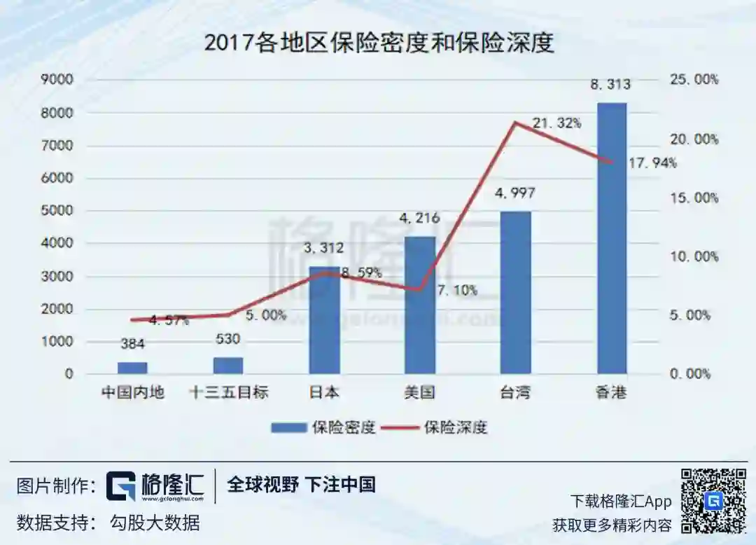 保险行业的长期发展逻辑依然不变,就是足够的增长空间。2017 年中国的保险深度只有4.57%,远低于日本的 8.59%及美国的 7.10%。此外,2017年中国的保险密度只有 384 美元,同样远低于日本的 3312美元及美国的 4216 美元。
