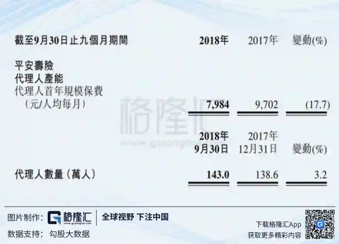 而中国平安寿险业务的业绩指标不可避免出现下滑,前三季度新业务价值仍保持3.2%的增速,而其中核心的代理人数增速也下滑至3.2%。