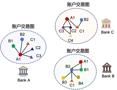因此,各个机构往往具有强烈的意愿去基于各方的图数据共同训练图神经网络。例如,若干银行共同训练反洗钱模型往往能得到分类准确率更高的图神经网络(如图一所示);多个研究机构希望能融合各自拥有的知识图谱来更准确地补全缺失的知识;多家药企已经开始尝试基于大家各自拥有的分子标注联合训练用于新药发现的图神经网络。