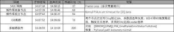 经过深入分析,发现是 SAN 存储交换机到核心交换机连接的一个端口出现了故障。虽然配置了多路径转发,但由于操作系统内核的超时时间与 OceanBase 切主时间不匹配,触发了 OceanBase 的自动选主操作。