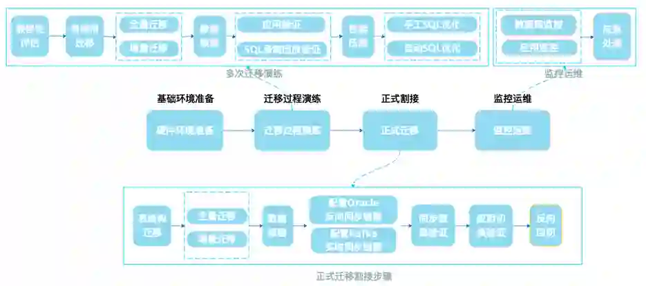 该公司针对传统核心复杂的数据库情况进行全面验证,最终形成了 140 页的迁移操作手册和详细的割接行事历,为后续系统的迁移和大面积推广积累了宝贵的经验,并形成了标准的迁移割接方案。整体迁移方法过程如下,从“基础环境准备 -- 迁移过程演练 -- 正式割接 -- 监控运维”等四大环节进行逐项拆解,落实到人,精确到分。