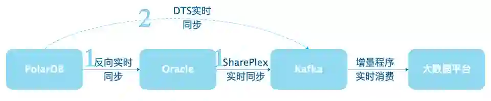 增加 PolarDB 到 Oracle 的反向实时同步,原有 Oracle 到 Kafka 同步链路不变,避免数据库切换带来太大的变动;