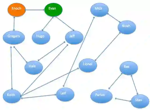 下图是已知的一份人物通联关系图,每两个人之间的连线表示两人有一定关系,可以是同事或者亲人关系等。已知“Enoch”是信用用户,“Evan”是欺诈用户。需要通过图算法,计算出其它人的信用指数,即得到图中每个人是欺诈用户的概率。这个数据可以方便相关机构做风控。
