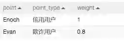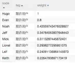使用标签传播分类组件除了需要所有人员的通联图数据以外,还要有人员打标数据。本实验通过已知数据(读数据表)组件导入打标数据(“weight”表示目标是欺诈用户的概率),如下图所示: