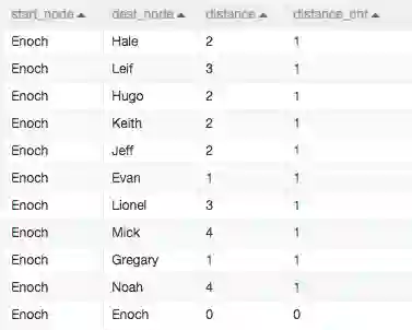 通过单源最短路径组件探查出每个人的一度人脉、二度人脉等关系。“distance”表示“Enoch”通过几个人可以联络到目标人,如下图所示: