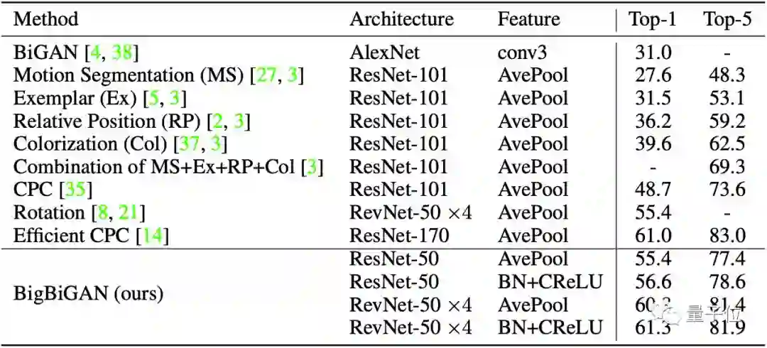 在ImageNet图像分类任务上,BigBiGAN成为了无监督算法中的地表最强。
