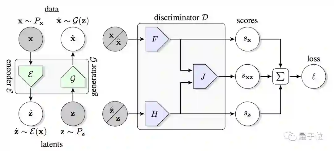 那么,它要区分的不是真图和假图,而是真图与潜变量组成的对子 (来自编码器) ,和假图与潜变量组成的对子 (来自生成器) 。