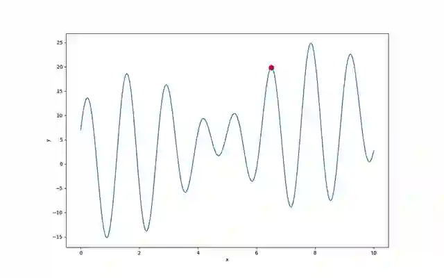 首先我们先对一个简单的具有多个局部极值的函数进行优化,我们来使用内置的算子求函数 f(x)=x+10sin(5x)+7cos(4x)的极大值,x的取值范围为[0,10]
