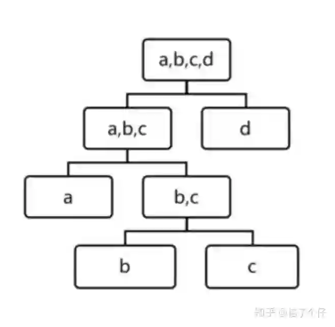 原理超简单,但检测效果可以说是state of the art. 对一个空间进行二分,早划分「孤立」出来的就是很可能异常的。「孤立」指的是这一边只有这一个数据点。因为是二分,我们可以构建一颗二叉树。例如下图的一棵树,第一次二分,左边有数据的a,b,c,右边只有d,那么d大概率就是异常点。为啥?想想你画一条线,把一把米分成了两边,左边只有一粒,那左边那粒很可能是离其他米粒很远。