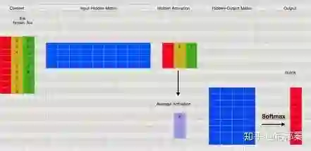 举个简单的例子:词表大小为9的一段文本序列one-hot,乘以一个参数矩阵(蓝色部分),做均值pooling,乘以一个参数矩阵然后经过softmax层得到对应目标单词的概率向量(最后的红色部分),向量维度为词表大小,再根据ground truth反向传播优化参数矩阵,最后得到的就是类似图1的参数矩阵,列为词表大小9,行为词向量的维度4(注意:参数矩阵方向跟图1反过来了)。