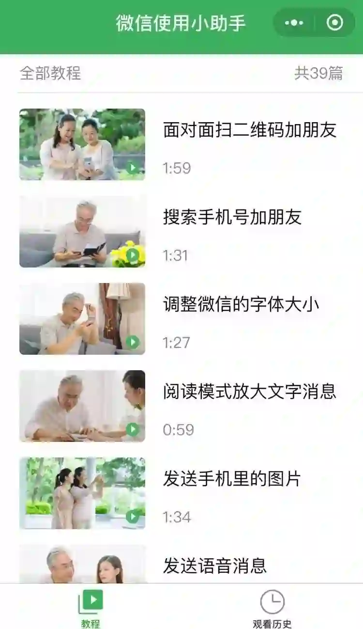 “这个简直棒,微信官方出品的,包含微信几乎所有核心场景的视频教程,真人上镜,口语解说,直接把视频列表分享给妈妈,完全不用我蹩脚的电话或手把手教学了。”