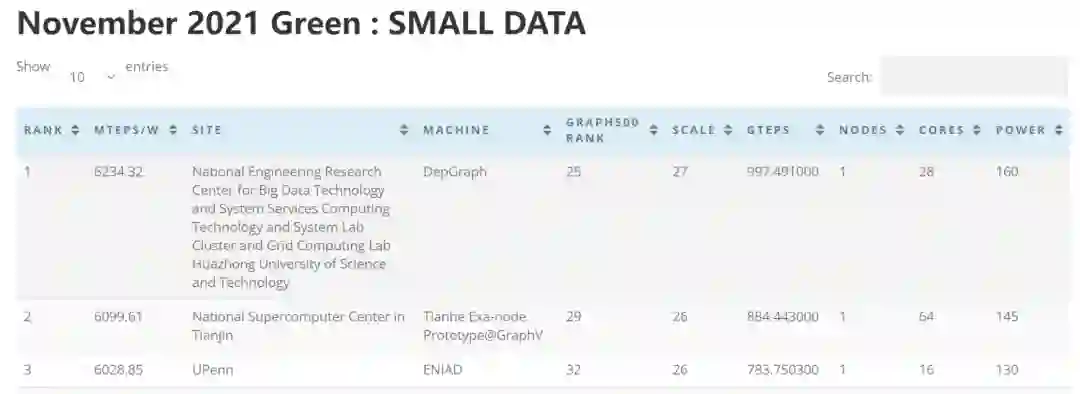在Green Graph 500排名的Small Data任务表现上,DepGraph性能功耗比排名全球第一,达到每瓦6234.32MTEPS。