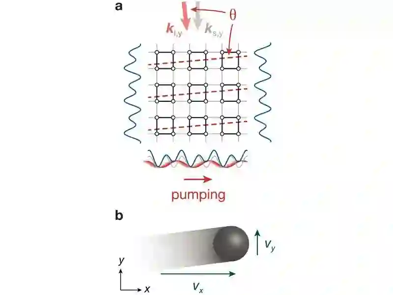 二维拓扑电荷泵的光学超晶格。(a)由干涉激光光束创造出的二维超晶格势,形成一种鸡蛋纸盒一般的“水晶灯”,原子安放在其中。(b)沿着水平的X轴随着时间调制的势,引发了原子在晶格中的移动。这种沿着X轴的快速移动与二维量子霍尔效应相等,而沿着横向方向的缓慢移动揭示了四维量子霍尔效应的存在。