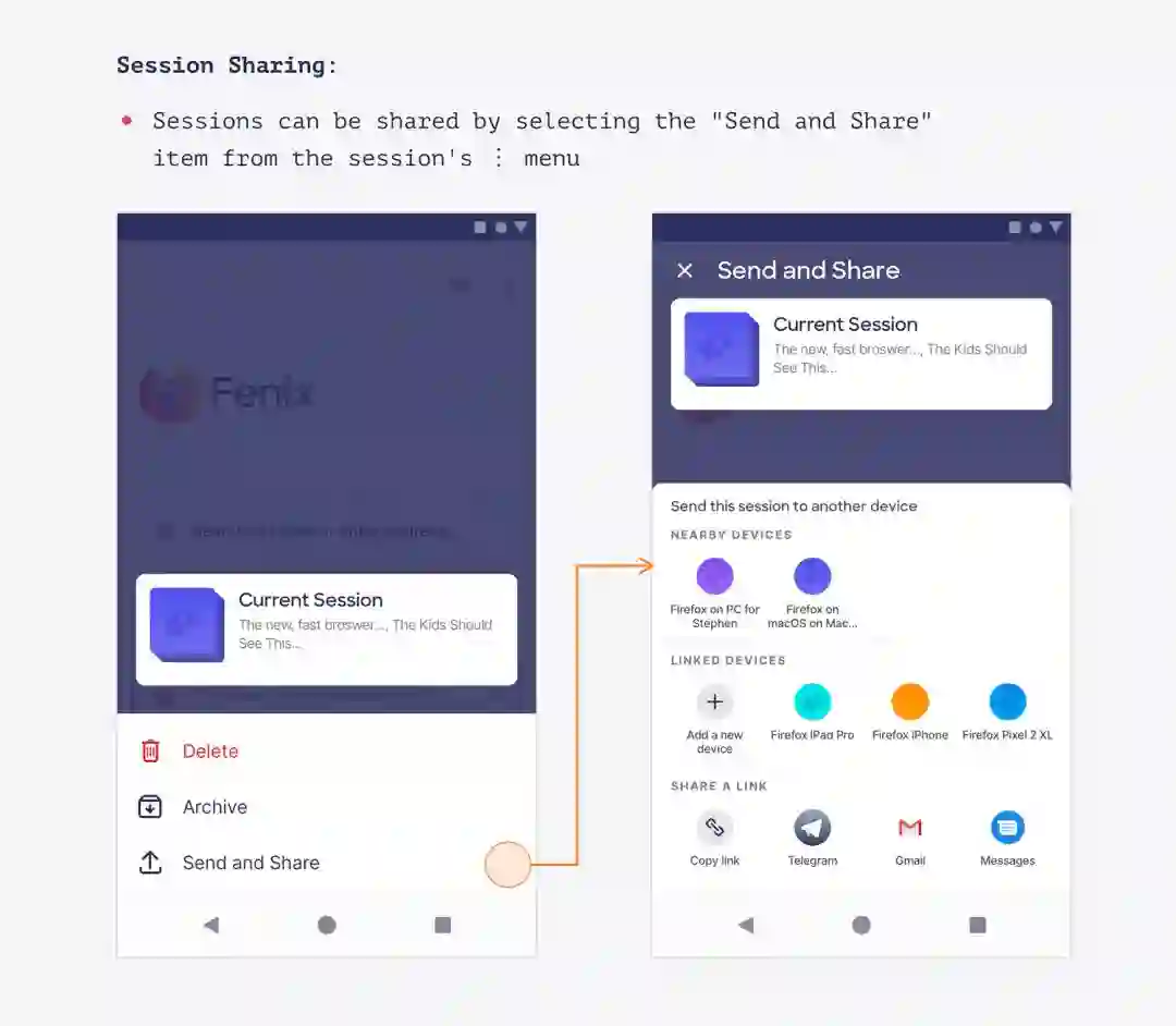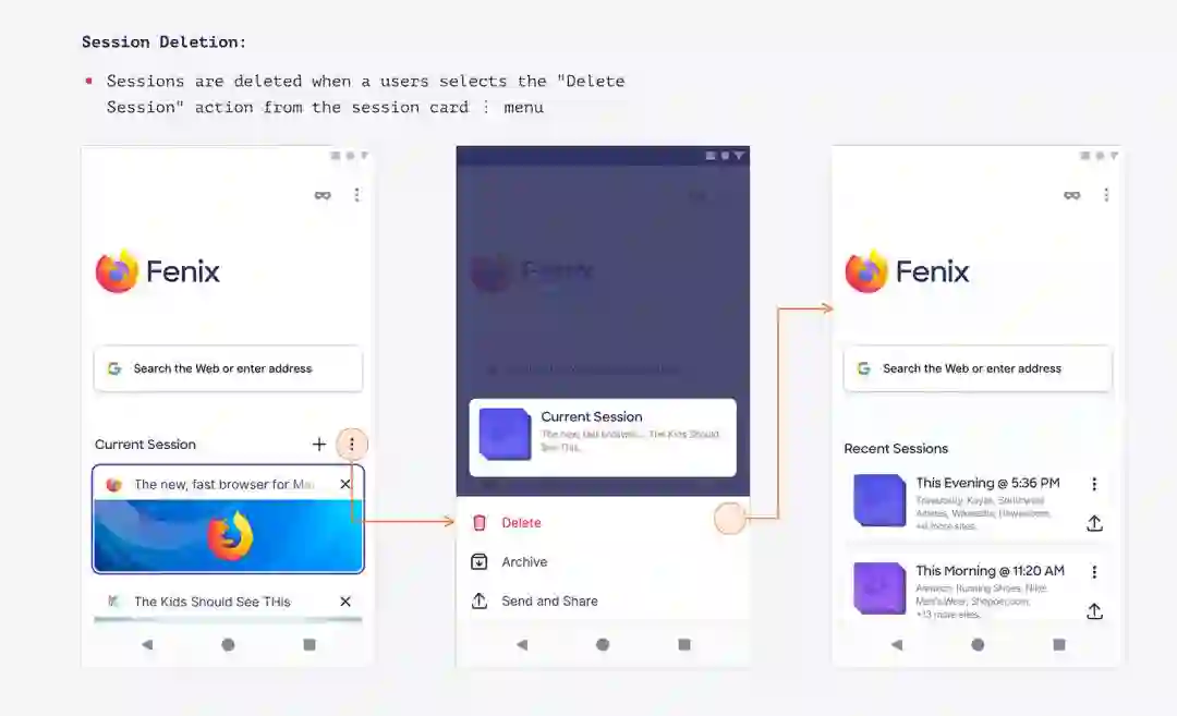 当浏览完并关闭浏览器后,这些选项卡将保存在称为会话的捆绑包中。也就是说,当再次返回 Fenix 时,可以启动一个新的浏览会话或返回到已经启动的会话。当前使用的各个选项卡可以全宽显示,可以手动保存为会话。