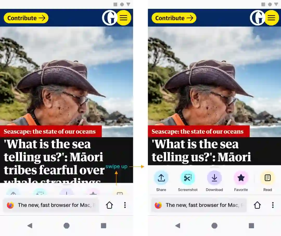 得益于智能手机开始采用的无边框设计,Firefox Fenix 的界面占比也十分高,使用者可以将最常用的 UI 元素放在底部,然后向上滑动以显示进一步的操作。