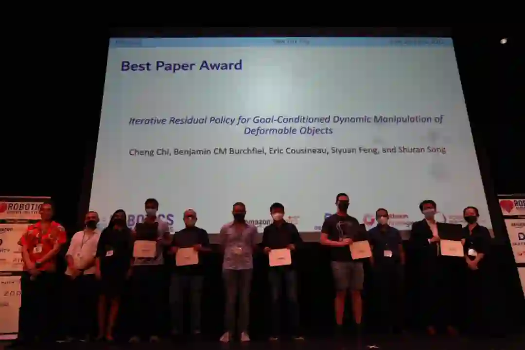 获得本届最佳论文奖的研究是《Iterative Residual Policy for Goal-Conditioned Dynamic Manipulation of Deformable Objects》。