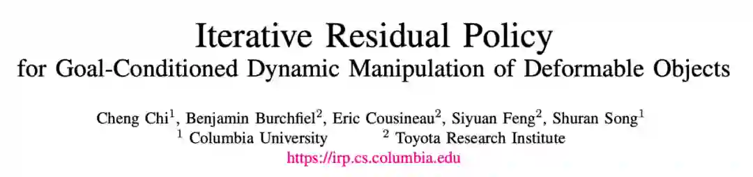 该论文研究了可变形物体的目标条件动态操作问题。基于其复杂的动力学 (物体变形和高速动作) 和严格的任务要求(精确的目标规范),这项任务非常具有挑战性。为了应对这些挑战,研究者提出了迭代剩余策略(IRP) ,这是一个适用于具有复杂动力学的可重复任务的通用学习框架。