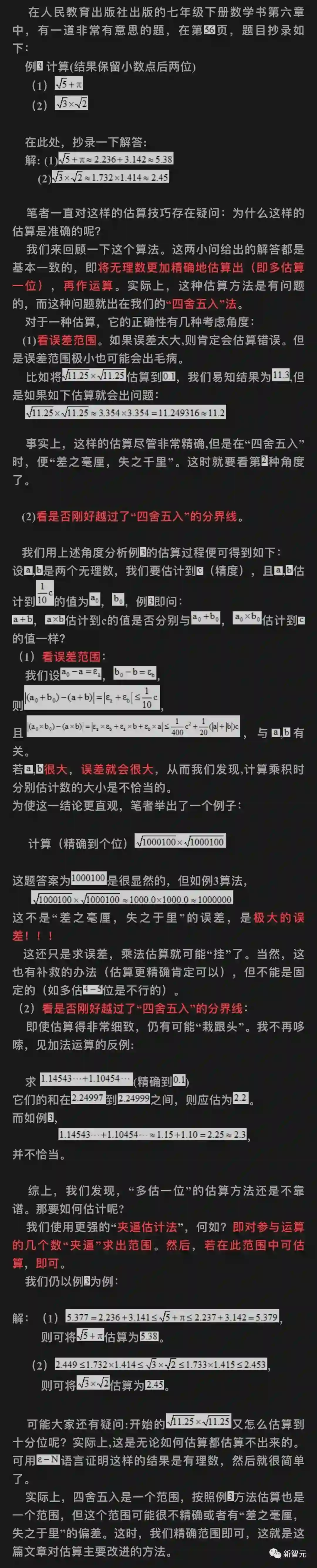 在这篇《无理数估算问题》中,他用论文指出:四舍五入是一个范围,按照例题方法估算也是一个范围,但这个范围可能很不精确,此时精确范围即可。