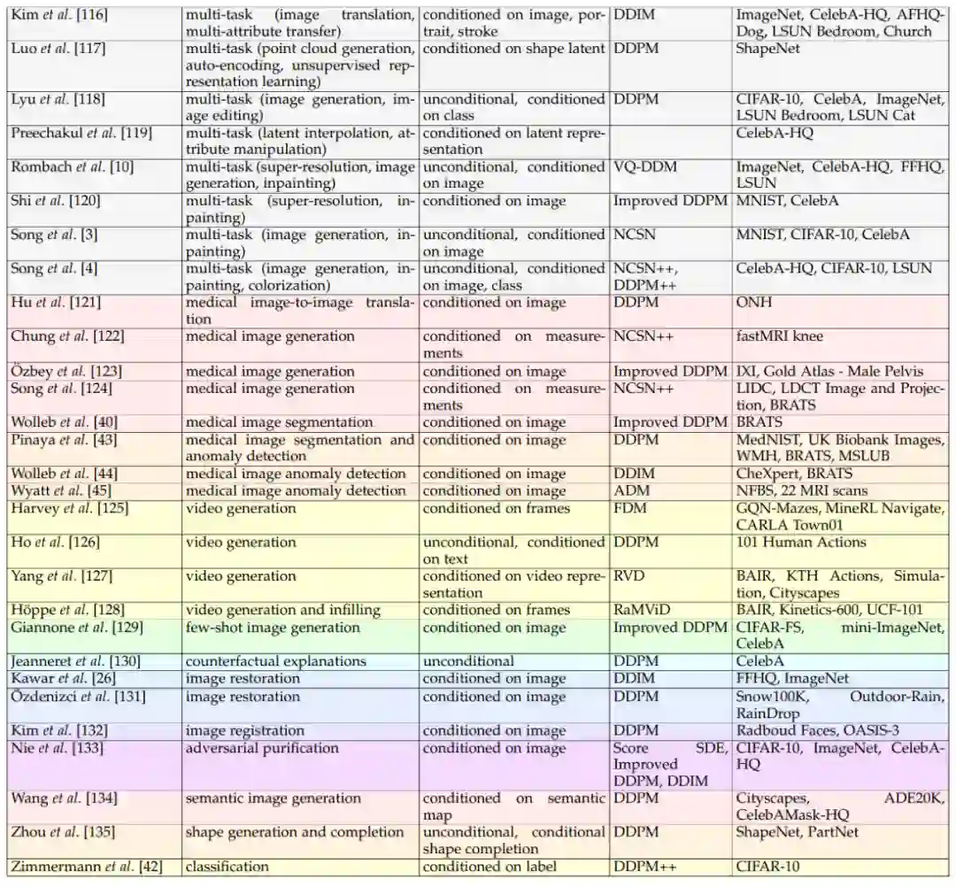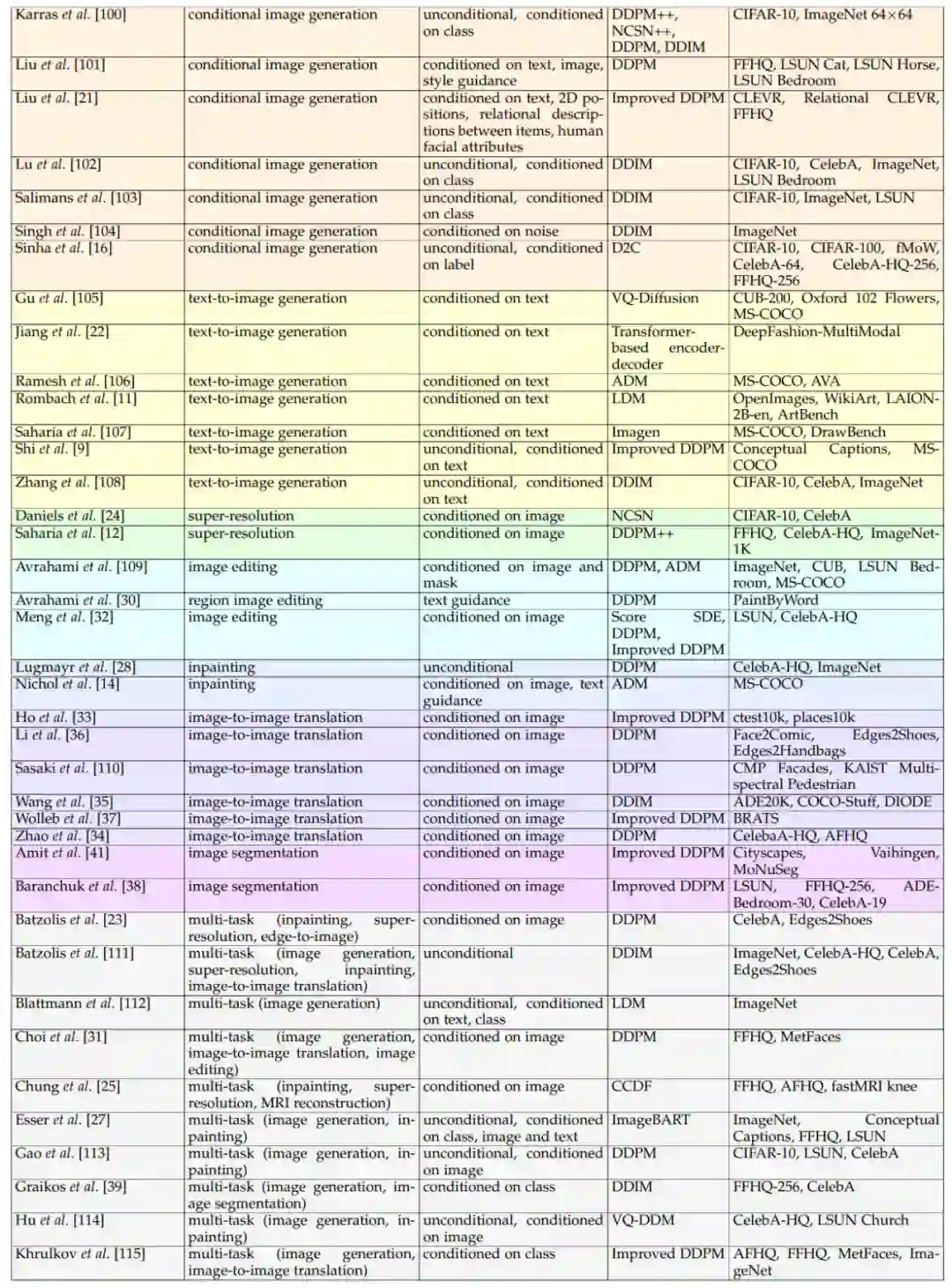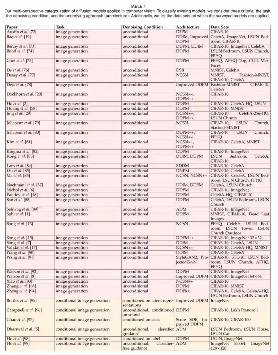 研究者考虑到不同的分类标准,将扩散模型归入一个多角度的分类法。也许区分模型的最重要标准是由(i)它们所应用的任务和(ii)它们所需要的输入信号来定义的。此外,由于在制定扩散模型时有多种方法,(iii) 基础架构是对扩散模型进行分类的另一个关键因素。最后,训练和评估过程中使用的数据集也非常重要,因为这有助于在同一任务上比较不同的 baseline。研究者根据前面列举的标准对扩散模型进行了分类,见表 1。