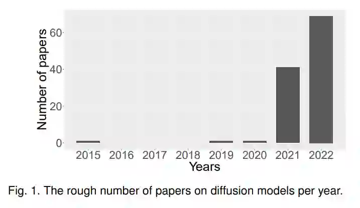 根据图 1 所示的图表,关于扩散模型的论文数量正在以非常快的速度增长。为了概述这个快速发展的主题从过去到现在的成就,本文作者对计算机视觉中去噪扩散模型的文章进行了全面回顾。