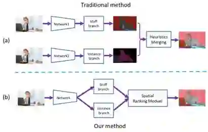 全景分割是场景理解之中一个充满挑战的课题。先前的全景分割方法通常包含三个独立的组件:1)前景分割模块; 2)背景分割模块以及 3)融合(merging)模块。如图 1(a)所示。