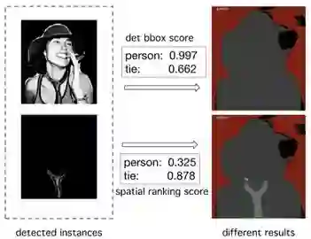 一般而言,可以按照检测分值降序排列实例,但是这一启发式算法在实际中很容易失败。比如,一个打领带的人,如图 7 所示。在 COCO 数据集中,由于人的类别比领带的出现频率更高,因此根据上述简单的原则,领带会被人遮住,导致性能下降。