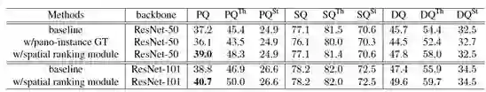 为验证空间排序模块算法的有效性,研究员在不同的基础模型下进行了实验,如表 3 所示。其中,w/ spatial ranking module 表示使用论文提出的空间排序模块得到的结果,从实验结果中可以看到,空间排序模块能够在不同的基础模型下大幅提高全景分割的评测结果。