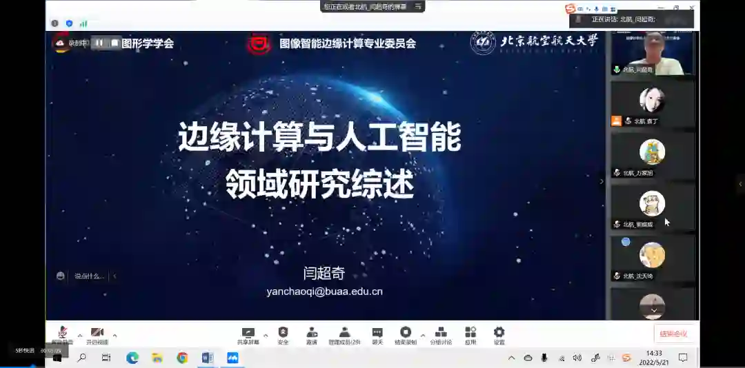 首先,由专委会主任张弘教授致开幕词,简单介绍了边缘人工智能在学术界及工业界相关应用的工作。接下来由演讲嘉宾闫超奇博士汇报《边缘计算与人工智能领域研究综述》,他以一个生动的“章鱼逃脱”案例引入边缘计算的概念,进而循序渐进地过渡到边缘计算与人工智能的基本概念和基础知识,介绍该领域研究的发展历史、分析该领域的发展趋势,探讨现今研究热点问题,并辅以具体案例介绍边缘人工智能在生产、生活、航空航天领域的应用。汇报结束后,引起了线上学生的热烈的反应,学生热情高涨,积极讨论,针对边缘人工智能的具体学术问题以及工程应用部署问题进行了咨询。演讲嘉宾李旭亮老师,万家旭博士,郭威威、沈天琦等从事一线研究工作的嘉宾也针对不同的问题进行仔细的解答,逐一交流等等。