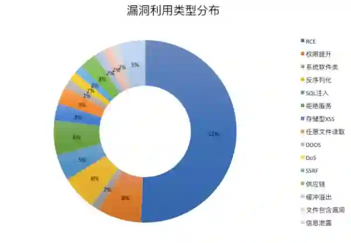 重点警惕这些漏洞:远程命令执行、权限提升、反序列化、SQL注入类型较高,其中远程命令执行漏洞占了51%,远程命令执行漏洞危害巨大,攻击者通过构造恶意请求,执行系统命令或读写文件,从而控制整个网站甚至控制服务器。